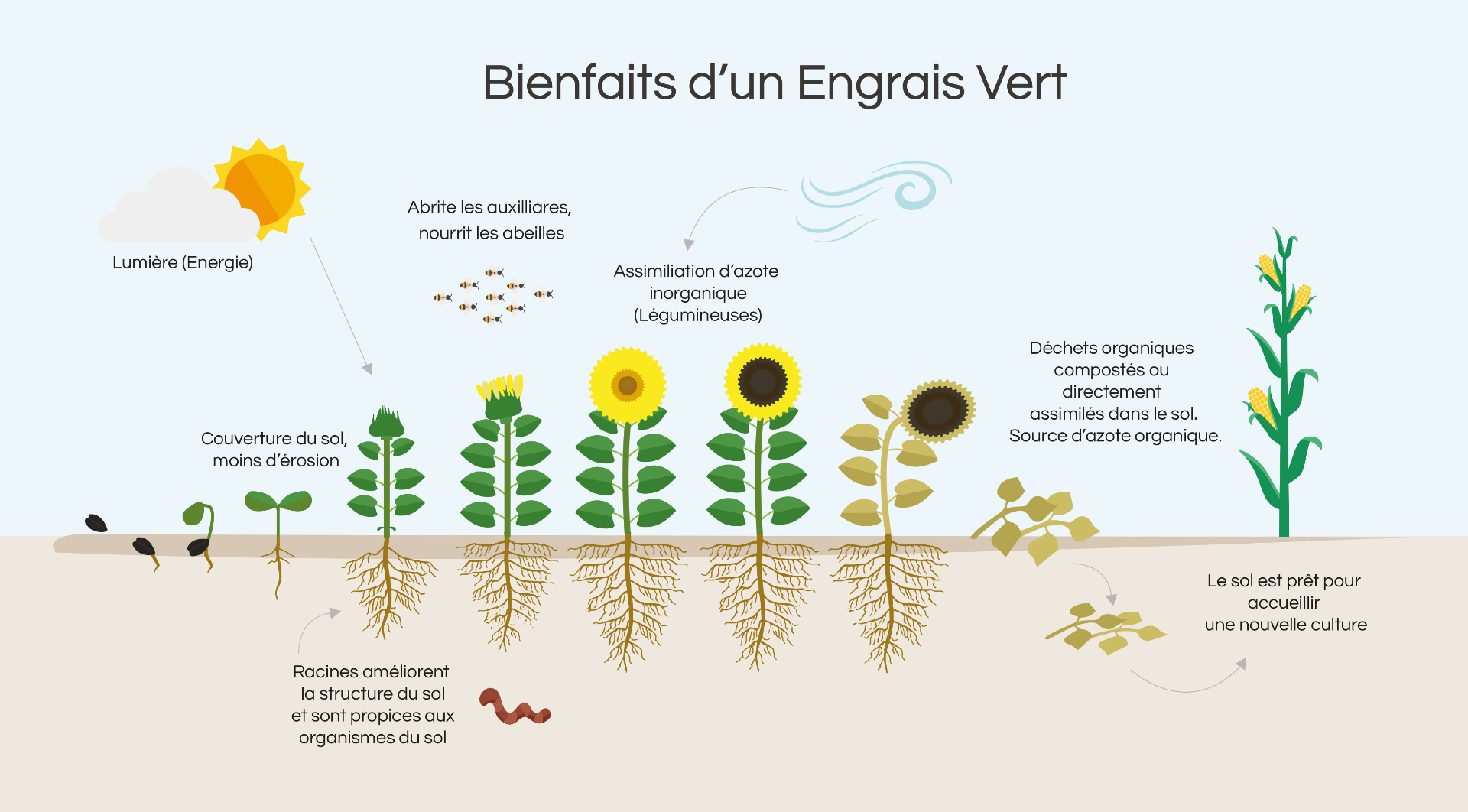 Les engrais verts sont aussi une bonne solution pour structurer et aérer le sol grâce à leur système racinaire, le couvrir et le protéger, et le fertiliser après fauchage (notamment avec les engrais verts composés de légumineuses tels que moutarde, féverole, vesce, pois, trèfle, qui captent l'azote de l'air et le stockent dans des nodosités racinaires, ce qui représente un apport longue durée d'azote lorsque les racines se décomposent).